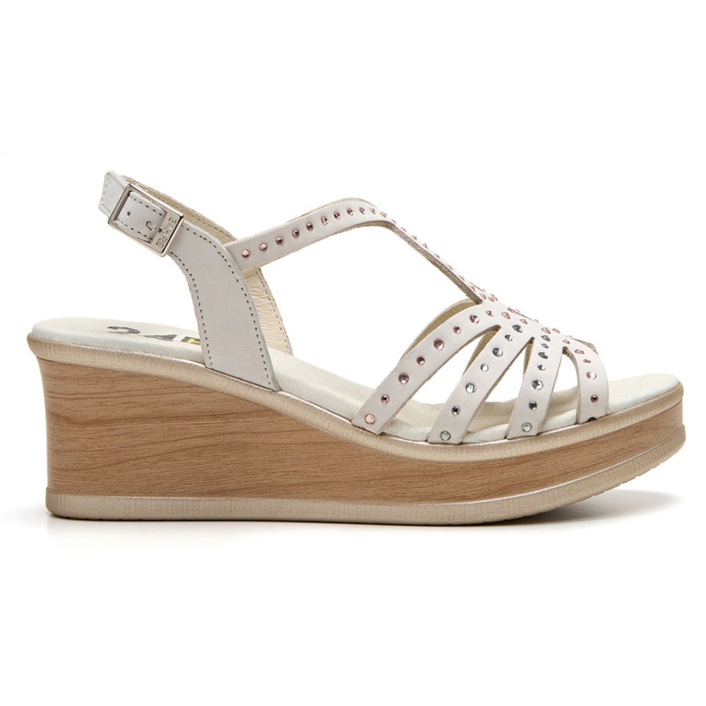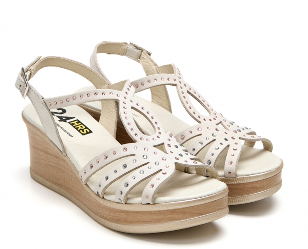 Sandalia con cuña y plataforma de la marca 24 horas para mujer. Fabricada con piel de gran calidad, detalles metalicos que aportan brillo y un toque moderno. Color beig