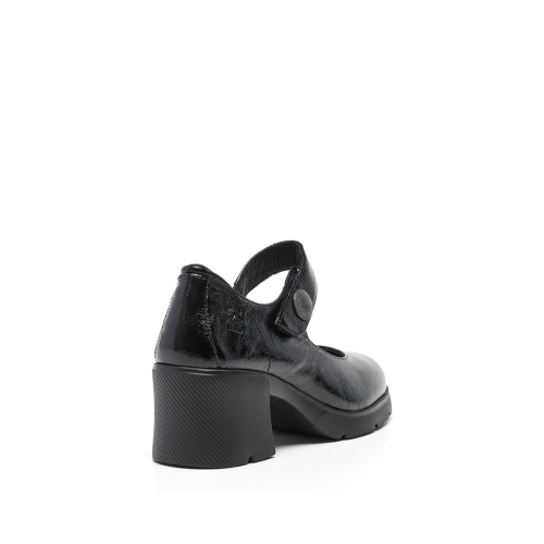 Zapato de tacon con pulsera en forma de velcro para una mayor comodidad y sujección. Fabricado en piel de gran calidad estilo charol, tacón y plataforma de goma antideslizante que aporta una gran amortiguacion. Color negro