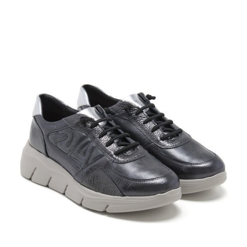 Deportiva 24 HRS en piel combinada con acabado metalizado y charol gris. Cierre mediante cordón elástico y plantilla extraíble para mayor confort. Suela de EVA ultraligera con altura de 5 cm y tecnología The Lightest, que proporciona ligereza