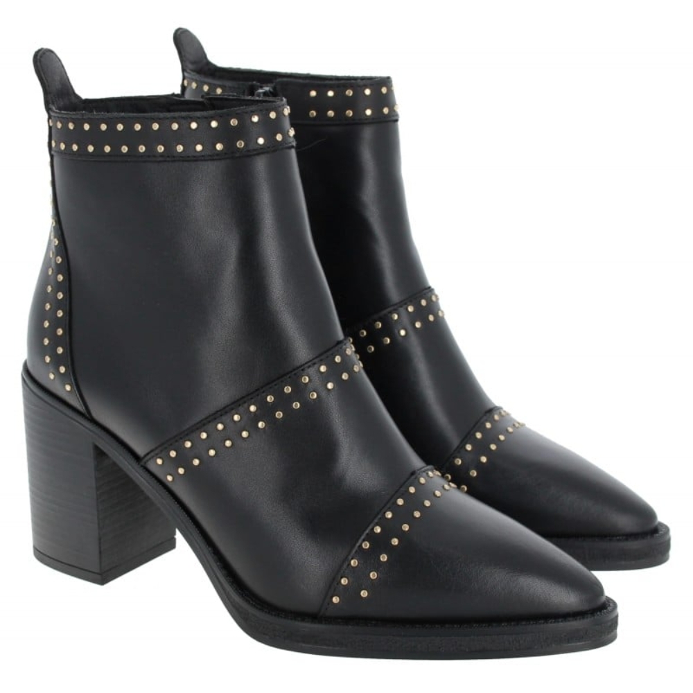 Los botines Alpe Camden para mujer en piel negra combinan sofisticación y comodidad. Están confeccionados en piel de primera calidad con un suave acabado de seda baby y forro textil transpirable. Con una elegante punta y sutiles detalles de tachuelas doradas, se asientan sobre un robusto tacón de bloque de 8,5 cm que les da un toque favorecedor. Una práctica cremallera lateral facilita su uso, mientras que la suela antideslizante proporciona una estabilidad fiable, lo que los convierte en perfectos tanto para looks informales como elegantes.