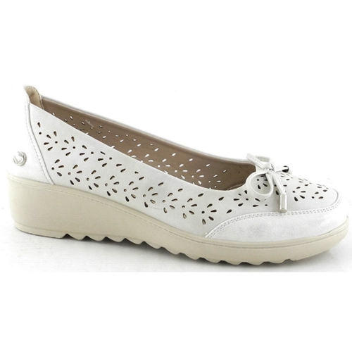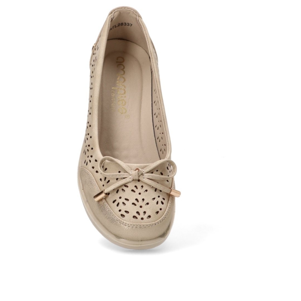 Bailarina con cuña baja de la marca Amarpies para mujer. Faricada en material sintético picado con lazo en el empeine con toques dorados ideales para fiesta o diario. Color beig