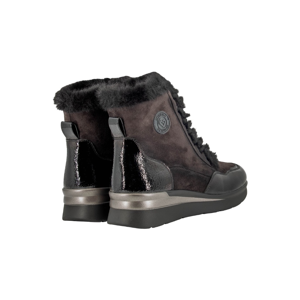 Botin con cuña baja y plataforma de la marca Amarpies para mujer. Fabricado en material sintético con detalle de pelo en los cordones, cremallera lateral para una mayor comodidad. Color negro