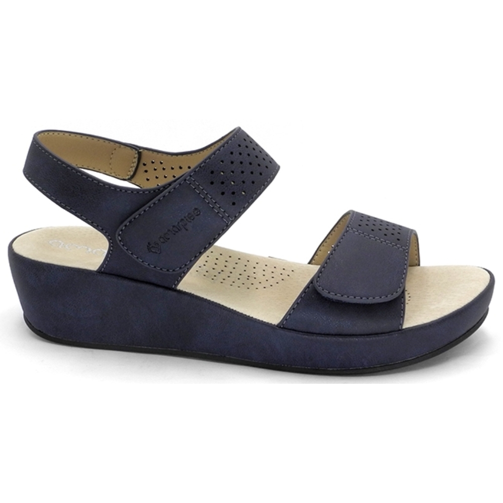 Sandalias cómodas con cuña para mujer en color marino. Características: Cierre de velcro, cuña 4 cm, zapato de estilo casual, suela de goma, exterior sintético, forro interior sintético y plantilla piel.