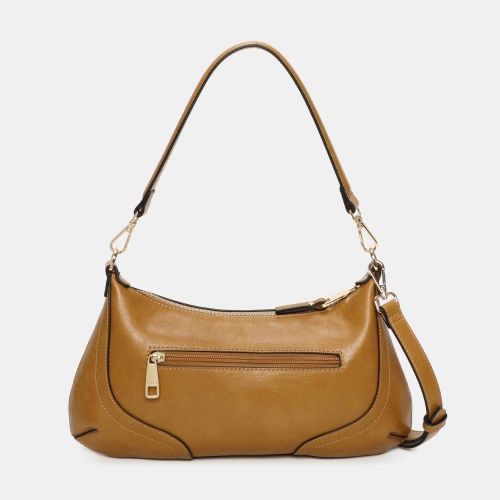 Bolso de hombro pequeño Binnari Lua en color camel. Confeccionado en material sintético de alta calidad. Formato compacto con asa corta y bandolera. Interior organizado con compartimentos. Detalle metálico decorativo. Medidas: 17 x 33 x 1 cm.