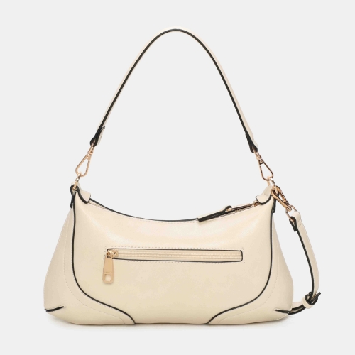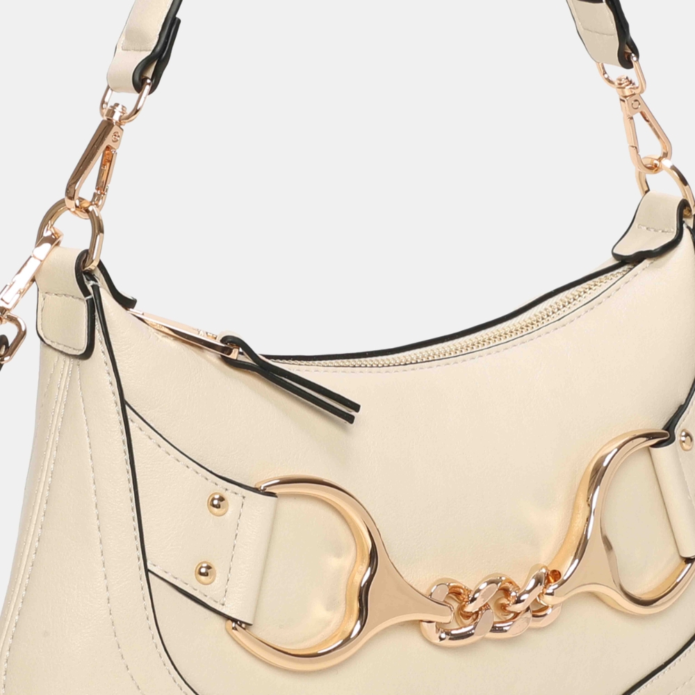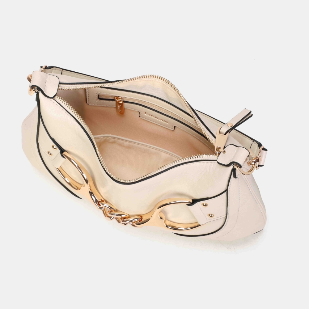 Bolso de hombro pequeño Binnari Lua en color hielo. Confeccionado en material sintético de alta calidad. Formato compacto con asa corta y bandolera. Interior organizado con compartimentos. Detalle metálico decorativo. Medidas: 17 x 33 x 1 cm.