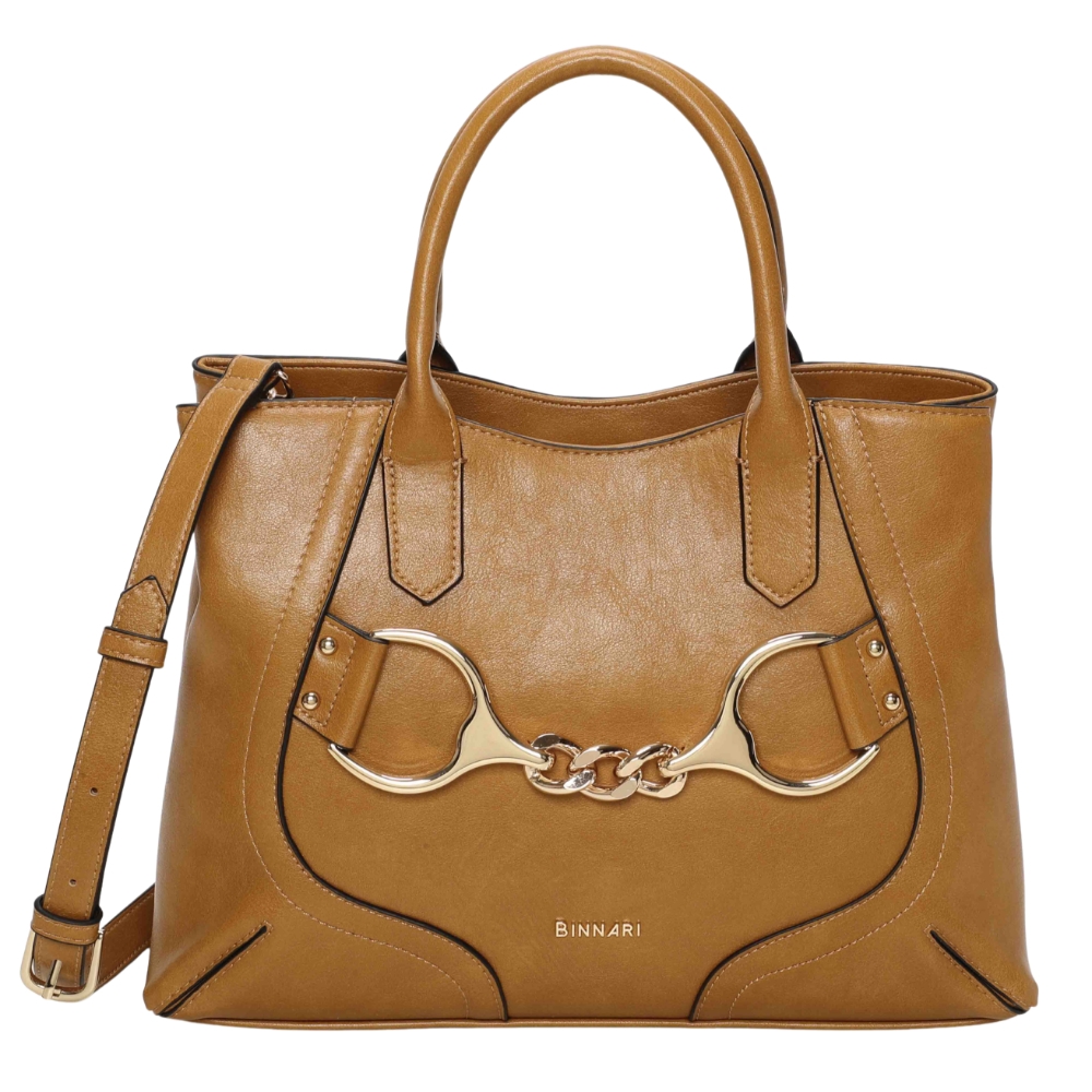 Bolso de mano Binnari Lua en color camel. Fabricado en material sintético resistente. Cierre de clip. Modelo de tamaño medio con asas cortas y bandolera extraíble. Interior organizado con varios compartimentos. Medidas: 25 x 33 x 12 cm.