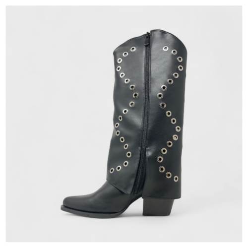 Bota solapa con detalles arandelas, facricada en material sintético que imita la piel. Cierre en cremallera lateral en la parte interior. Plantilla en sintético confort. Horma con terminación en punta cuadrada. Tacón con altura de 7cm.