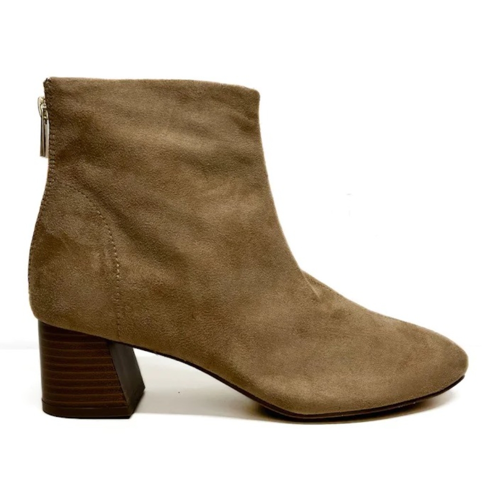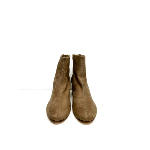 Botines en material efecto ante. Tacón medio ancho. Acabado en punta redondeada. Cierre mediante cremallera en la parte trasera.