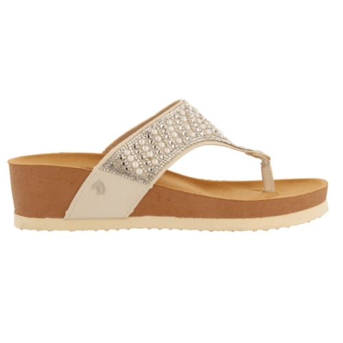 Chanclas tipo BIO con cuña y tira con pedrería y perlas. Planta suave y anatómica de microfibra. Piso muy ligero. ¡No te las querrás quitar!