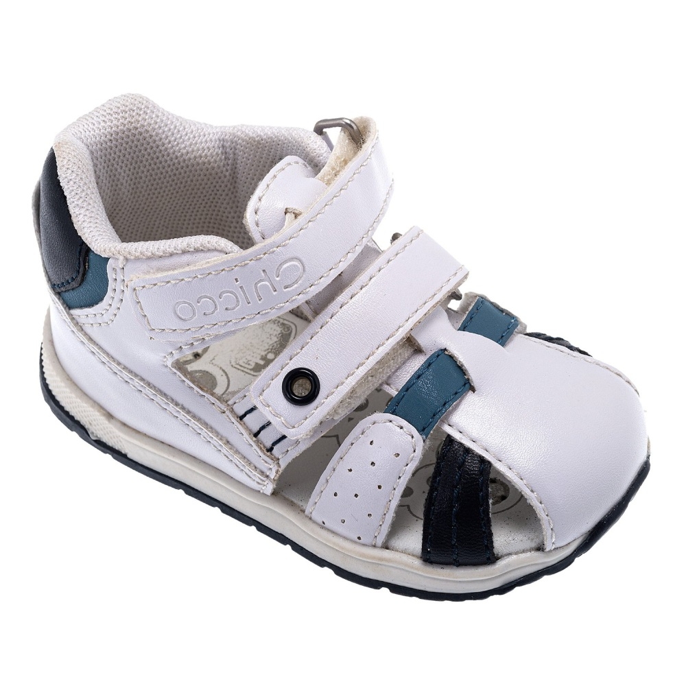 Sandalia de color blanco con puntera cerrada, revestida en polipiel con apliques en color azul.