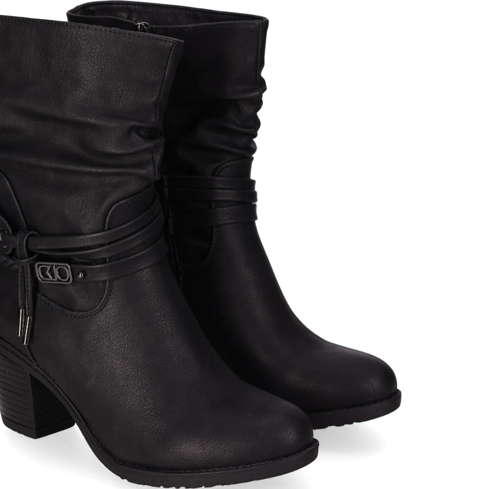 Botín de tacón medio con cremallera. Diseño clásico de botín de caña media, cremallera lateral, detalles decorativos. Diseño elegante y cómodo para ocasiones casuales o semi-formales. Ideal para destacar en cualquier outfit.