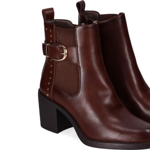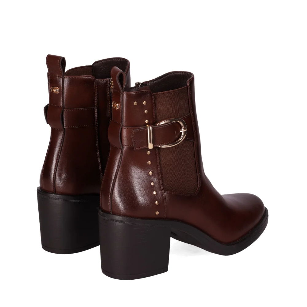 Botín con tacón chunky y hebilla lateral. Este botín presenta un diseño elegante y moderno, con un tacón chunky y una hebilla lateral decorativa con estoperoles metálicos. El panel elástico lateral facilita su uso y proporciona comodidad. Conviértelo en un básico en tu día a día.