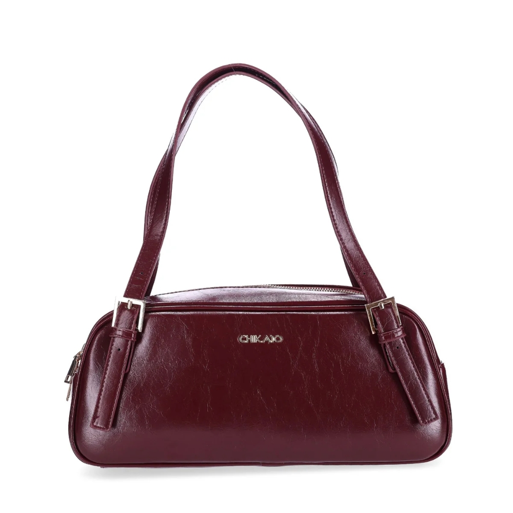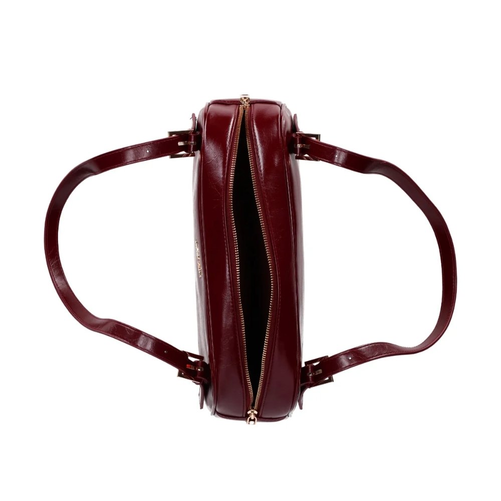 Bolso de Cuero con Diseño Ajustable: Este bolso presenta una forma rectangular con bordes redondeados y dos correas ajustables mediante hebillas decorativas. Su diseño elegante y funcional incluye el nombre de la marca en el frente, ideal para complementar un estilo moderno y práctico.