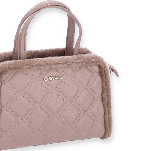 Bolso de Mano con Estilo Sofisticado: Este bolso presenta un diseño acolchado con detalles de pelo en los laterales. Tiene dos asas cortas y una correa ajustable, ambas sujetas con herrajes metálicos. Perfecto para complementar un look elegante y versátil.