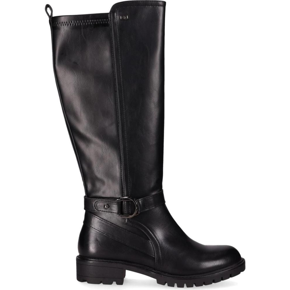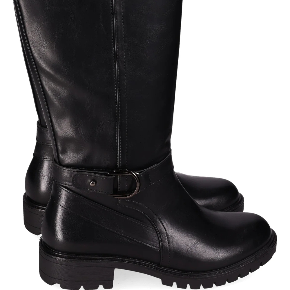 Bota alta con hebilla y suela dentada. Esta elegante bota alta hasta la rodilla, presenta una hebilla alrededor del tobillo a modo de pulsera decorativa. Con suela dentada y tacón bajo ofrecen comodidad y tracción. El diseño atemporal y versátil la hace perfecta para el día a día. ¡Camina con estilo!