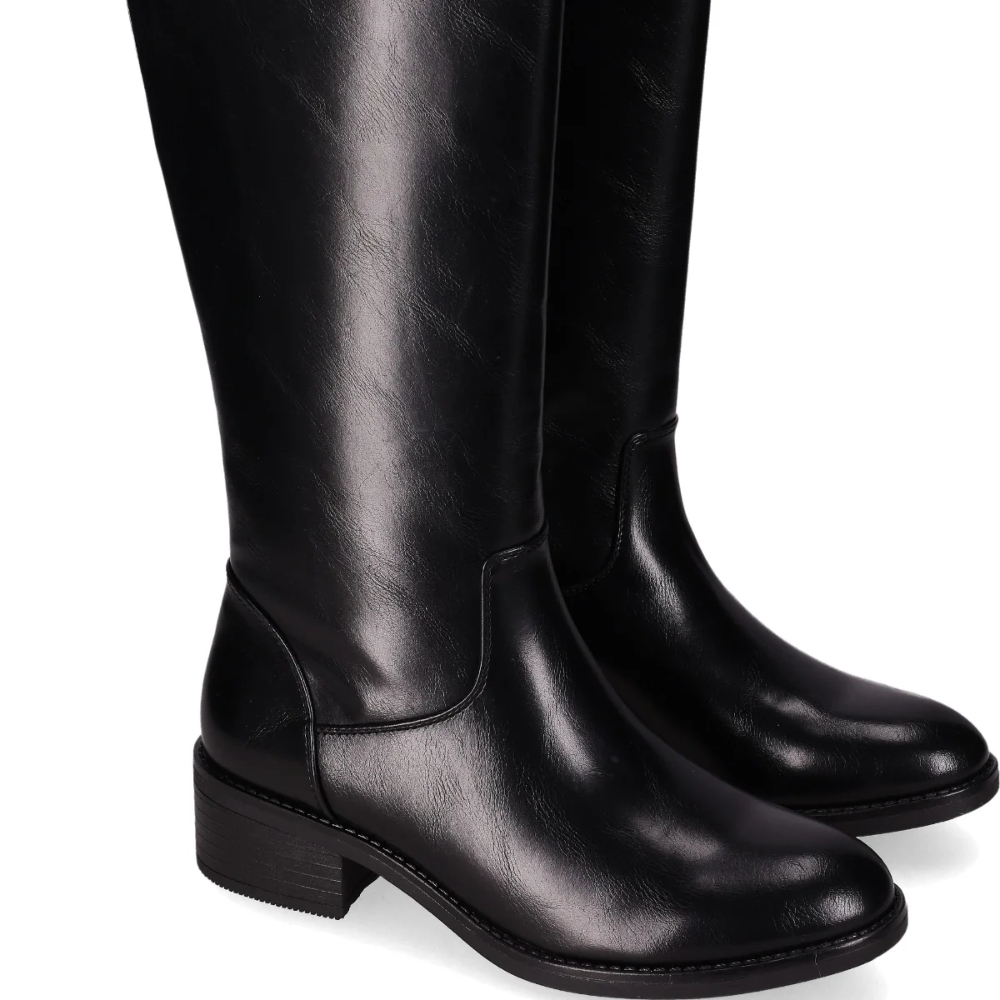 Botas de caña alta con tacón bajo. Elegantes botas altas de cuero liso, presentan un acabado brillante con un tacón cuadrado y un robusto estilo amaderado. Su diseño clásico y sofisticado es perfecto para combinar con cualquier outfit de invierno. ¡Aporta elegancia y confort a tus días fríos!