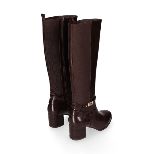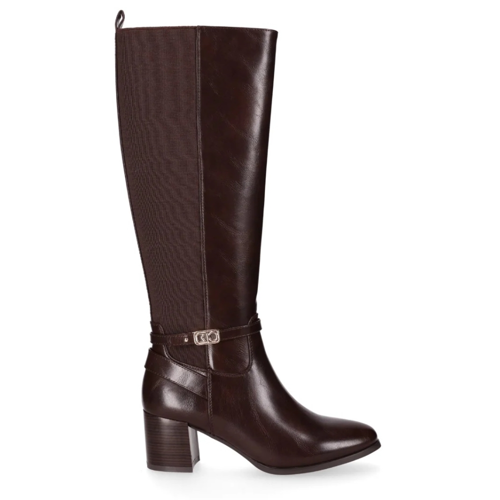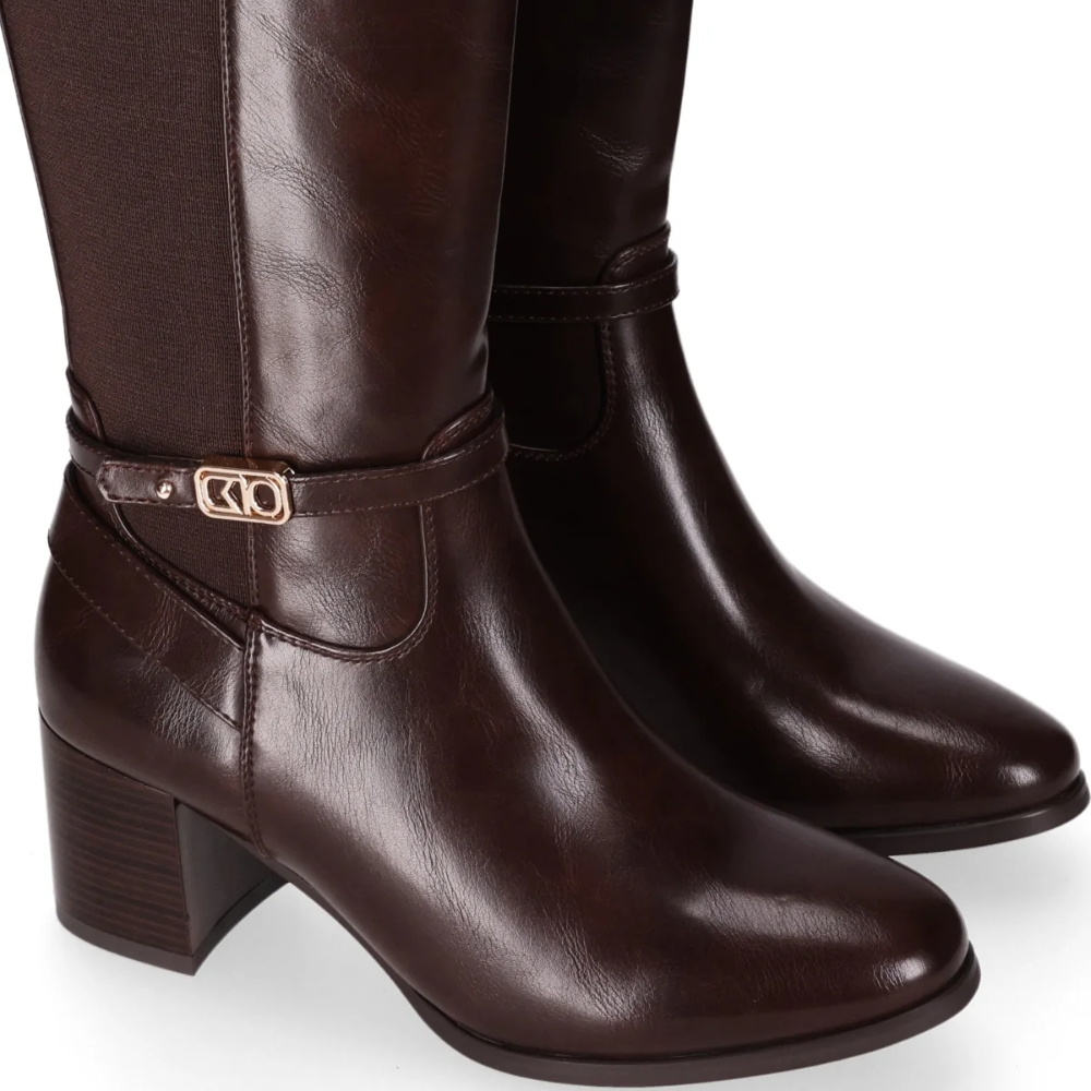 Botas altas con panel elástico. Este diseño hasta la rodilla cuentan con un acabado elegante en cuero pulido al frente y un panel elástico en la parte posterior para un ajuste perfecto. La correa decorativa con hebilla alrededor del tobillo añade un toque moderno. ¡Ideal para combinar estilo y funcionalidad en tus outfits!