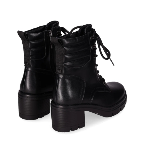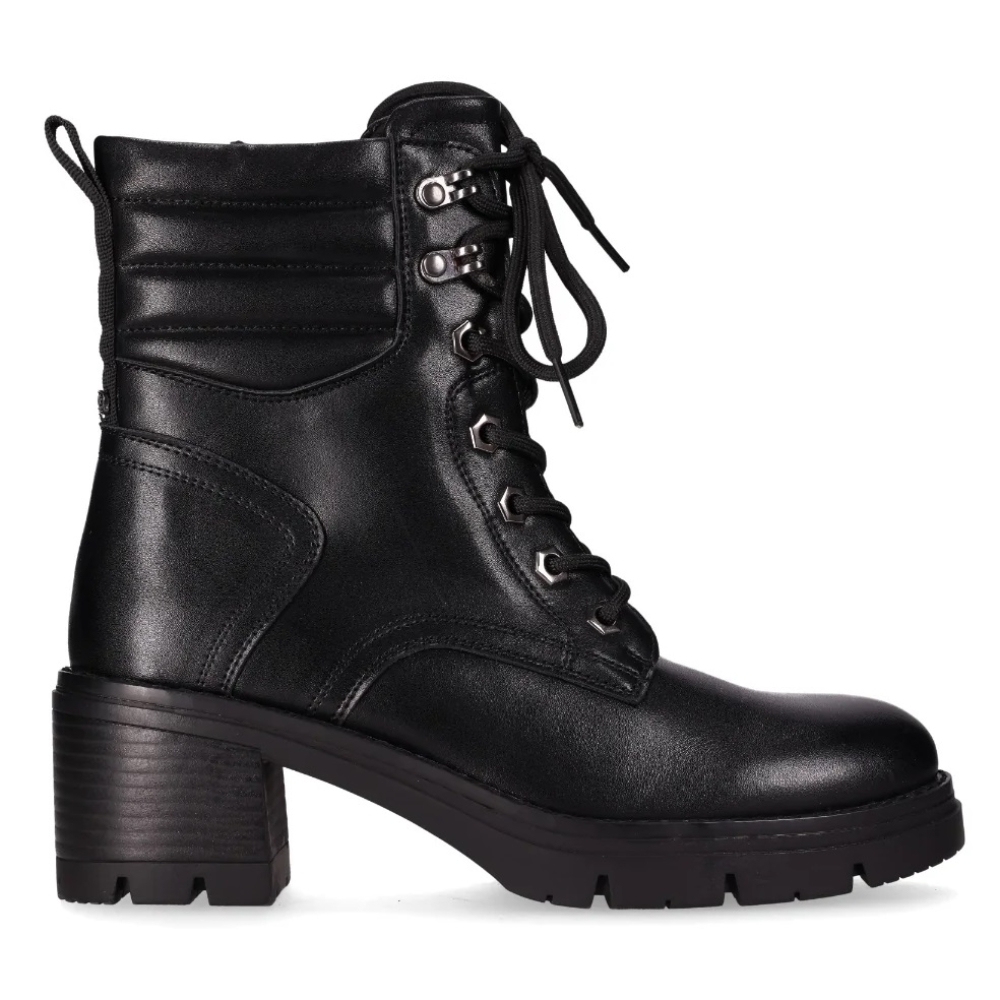 Botín de piel vegana con tacón chunky: Este botín cuenta con un tacón chunky, cordones con ojales dorados, collarín acolchado, y lengüeta trasera para mayor comodidad. La suela gruesa y con dibujo profundo ofrece excelente tracción. Perfecto para caminar por el lado elegante de la vida.