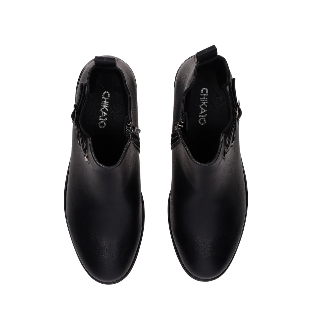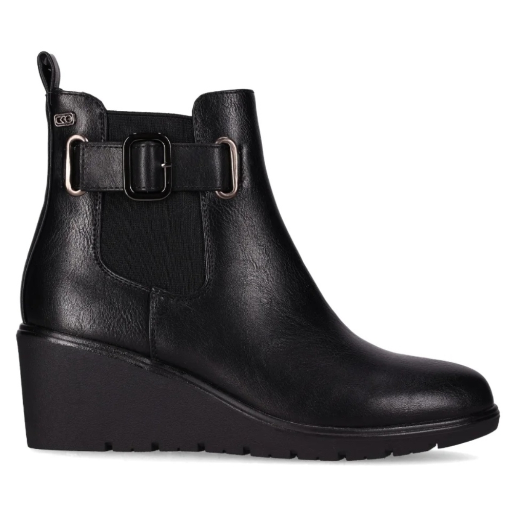 Botines de cuña baja en piel vegana. Diseñados con caña baja, cuentan con un tacón de cuña y una correa con hebilla decorativa en el lateral. El panel elástico garantiza un ajuste cómodo y práctico, además de su cremallera lateral para mayor adaptación. ¡Combina estilo moderno y funcionalidad en un solo paso!