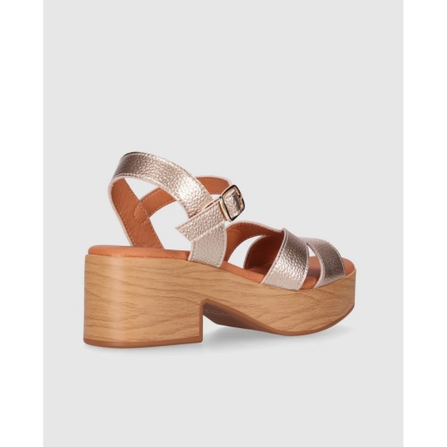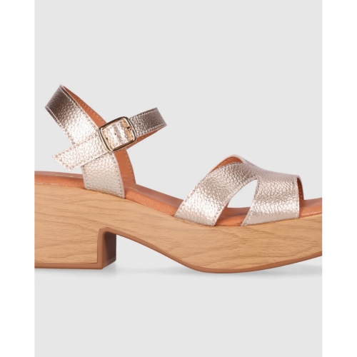 Sandalia de piel con plataforma efecto madera y tacón ancho que suma altura con una pisada estable. Sus tiras cruzadas y la pulsera con hebilla ajustable recogen el pie y estilizan el empeine. Póntelas y descubre que ganar centímetros también puede ser sinónimo de puro confort.