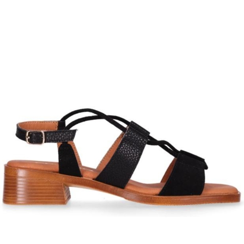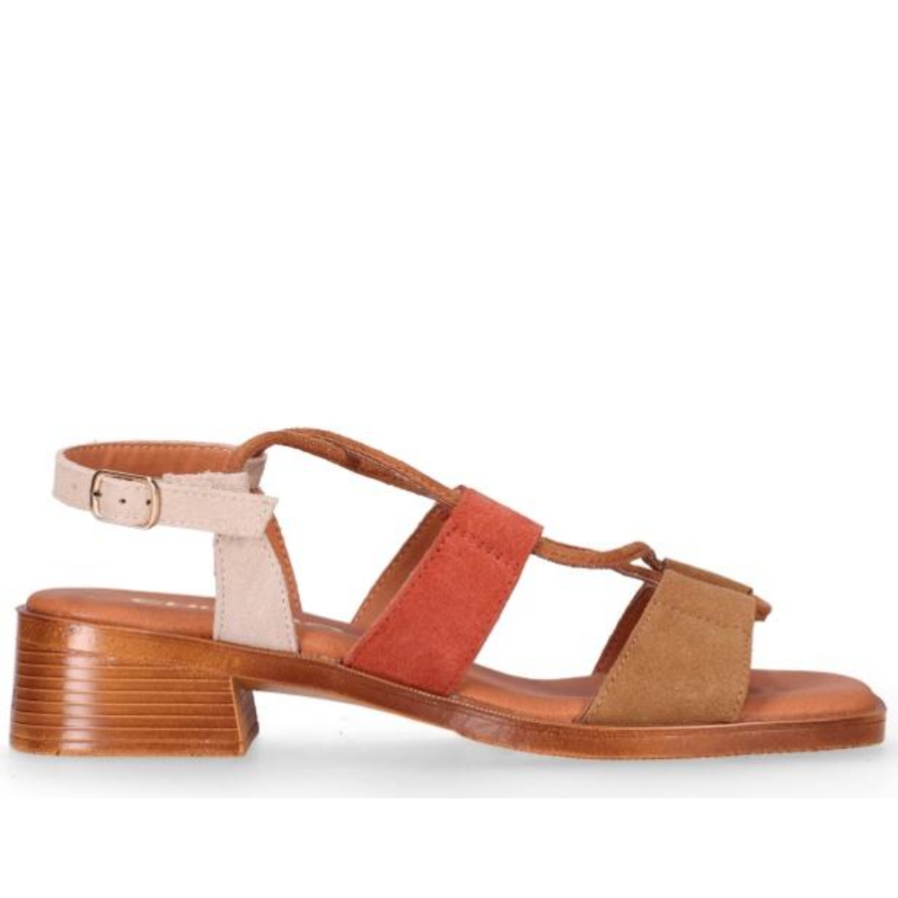 Sandalia de piel con tacón bajo y diseño multicolor en ante, compuesta por tiras anchas en tonos tierra y cierre de hebilla lateral. Aporta un toque de color y sofisticación manteniendo la comodidad en tus looks de verano.