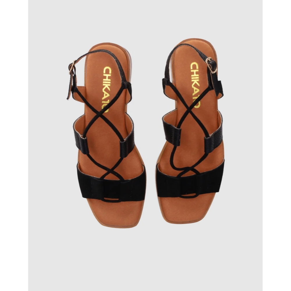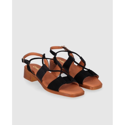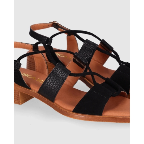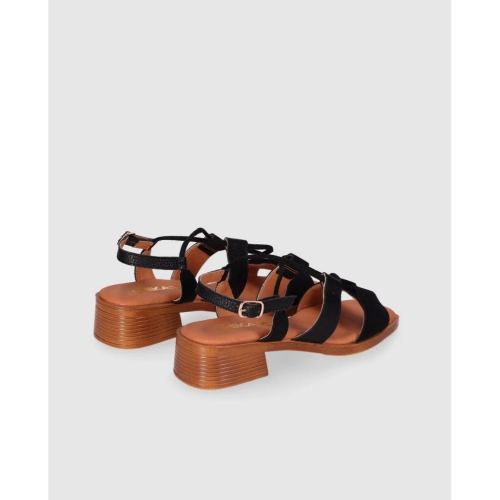 Sandalia de piel con tacón bajo y diseño multicolor en ante, compuesta por tiras anchas en tonos tierra y cierre de hebilla lateral. Aporta un toque de color y sofisticación manteniendo la comodidad en tus looks de verano.