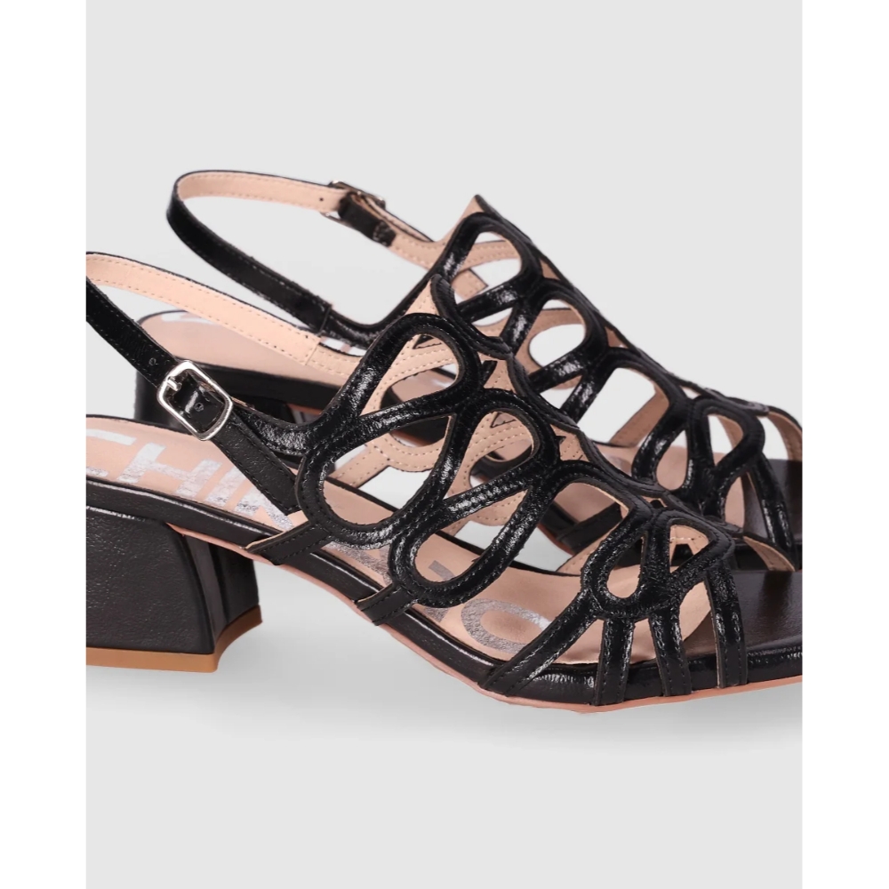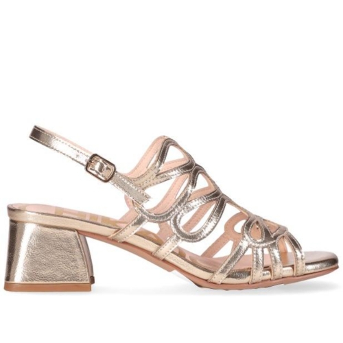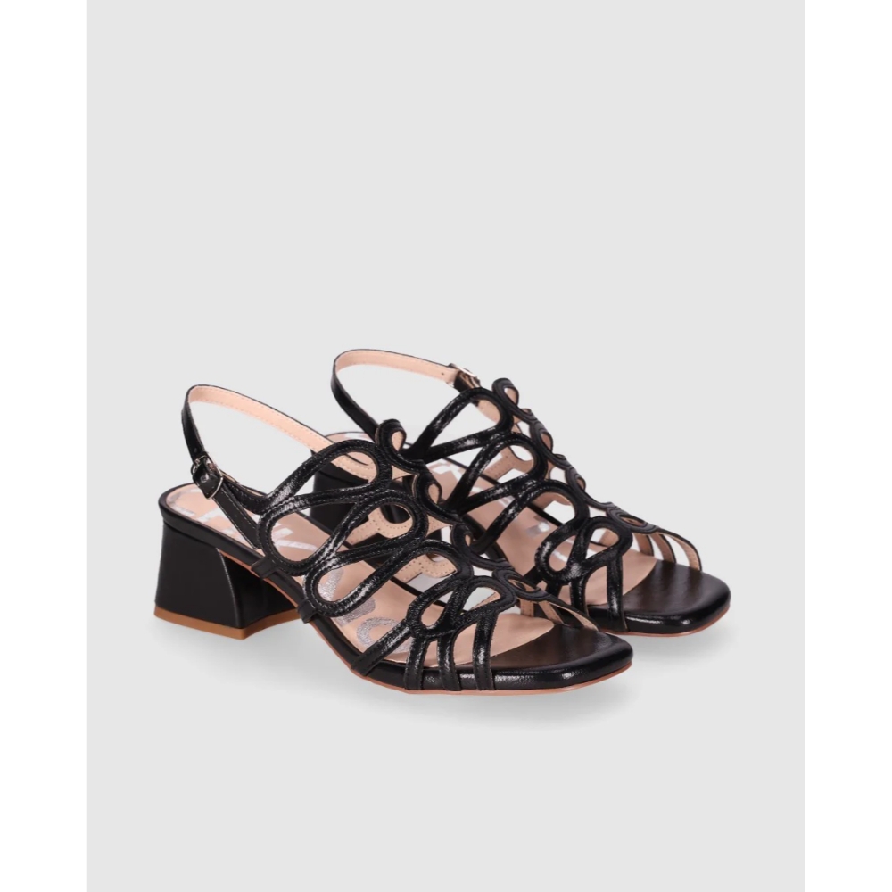 Sandalias de tacón medio con diseño calado que aporta ligereza y elegancia. Destacan sus tiras entrelazadas y el cierre de hebilla al tobillo que asegura un ajuste cómodo. Perfectas para completar tus looks más sofisticados sin renunciar a la comodidad.