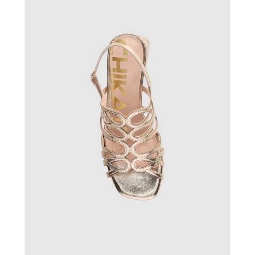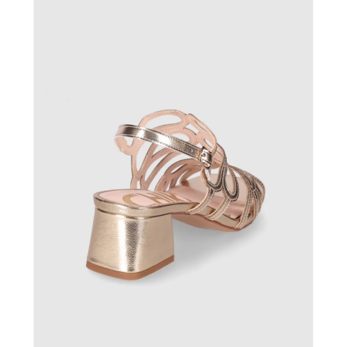 Sandalias de tacón medio con diseño calado que aporta ligereza y elegancia. Destacan sus tiras entrelazadas y el cierre de hebilla al tobillo que asegura un ajuste cómodo. Perfectas para completar tus looks más sofisticados sin renunciar a la comodidad.