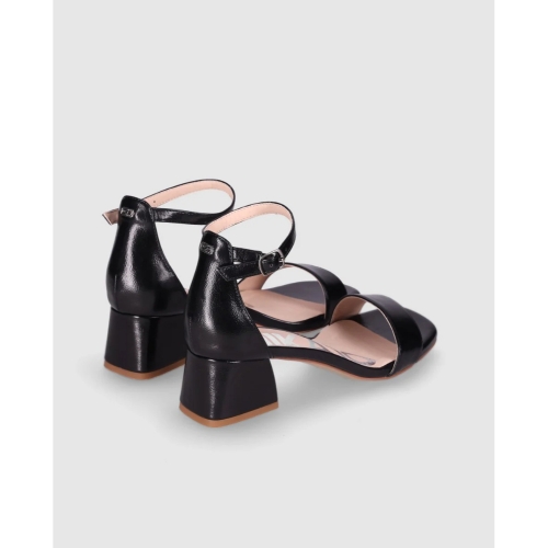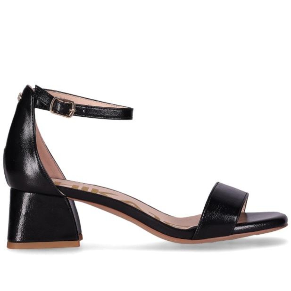 Sandalias de tacón medio con diseño minimalista y líneas limpias. Destacan su tira delantera ancha y el cierre de hebilla al tobillo que aporta estabilidad. Perfectas para combinar con cualquier look gracias a su estilo atemporal.