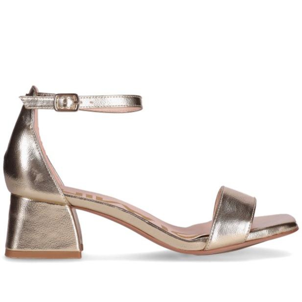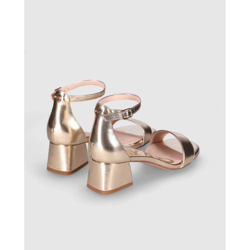 Sandalias de tacón medio con diseño minimalista y líneas limpias. Destacan su tira delantera ancha y el cierre de hebilla al tobillo que aporta estabilidad. Perfectas para combinar con cualquier look gracias a su estilo atemporal.