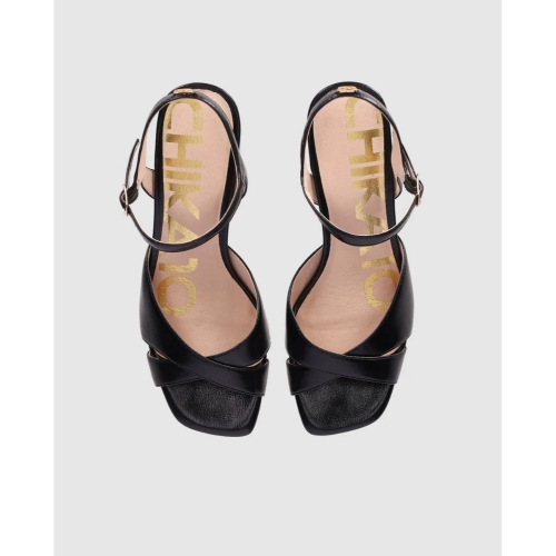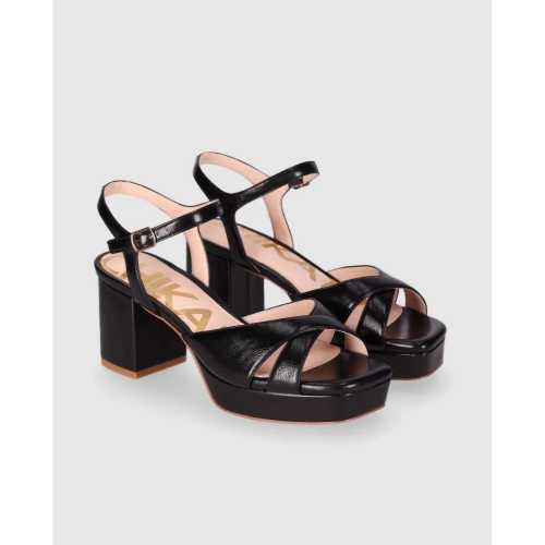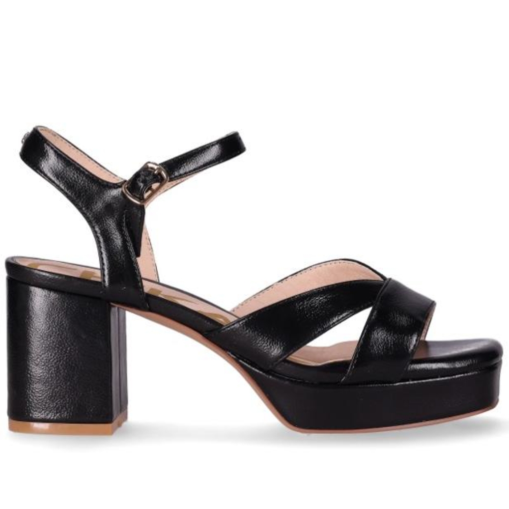 Sandalias de tacón ancho con plataforma delantera que aporta altura sin perder estabilidad. Destacan sus tiras cruzadas en la pala y el cierre de hebilla al tobillo que asegura un ajuste perfecto. Ideales para brillar con estilo en tus ocasiones especiales.