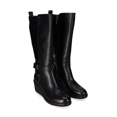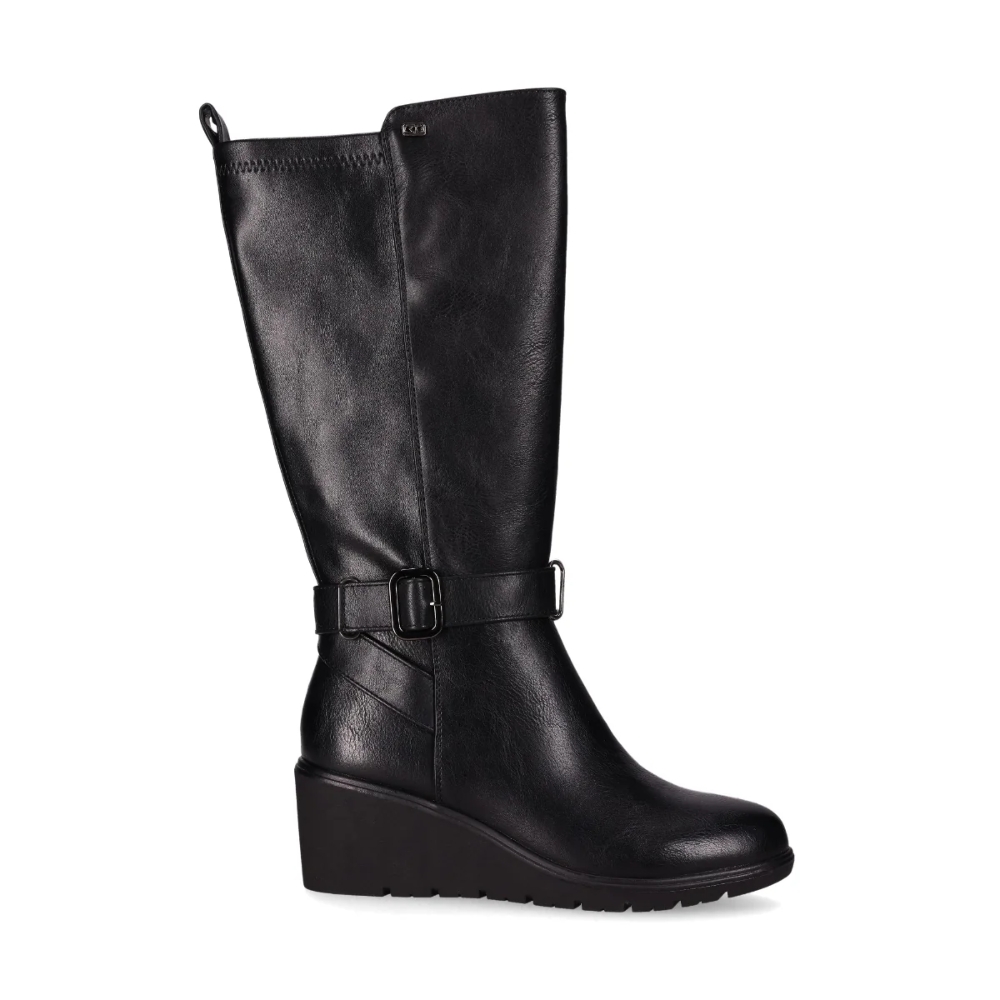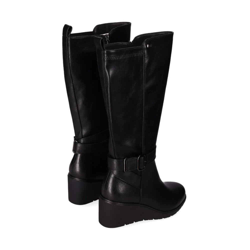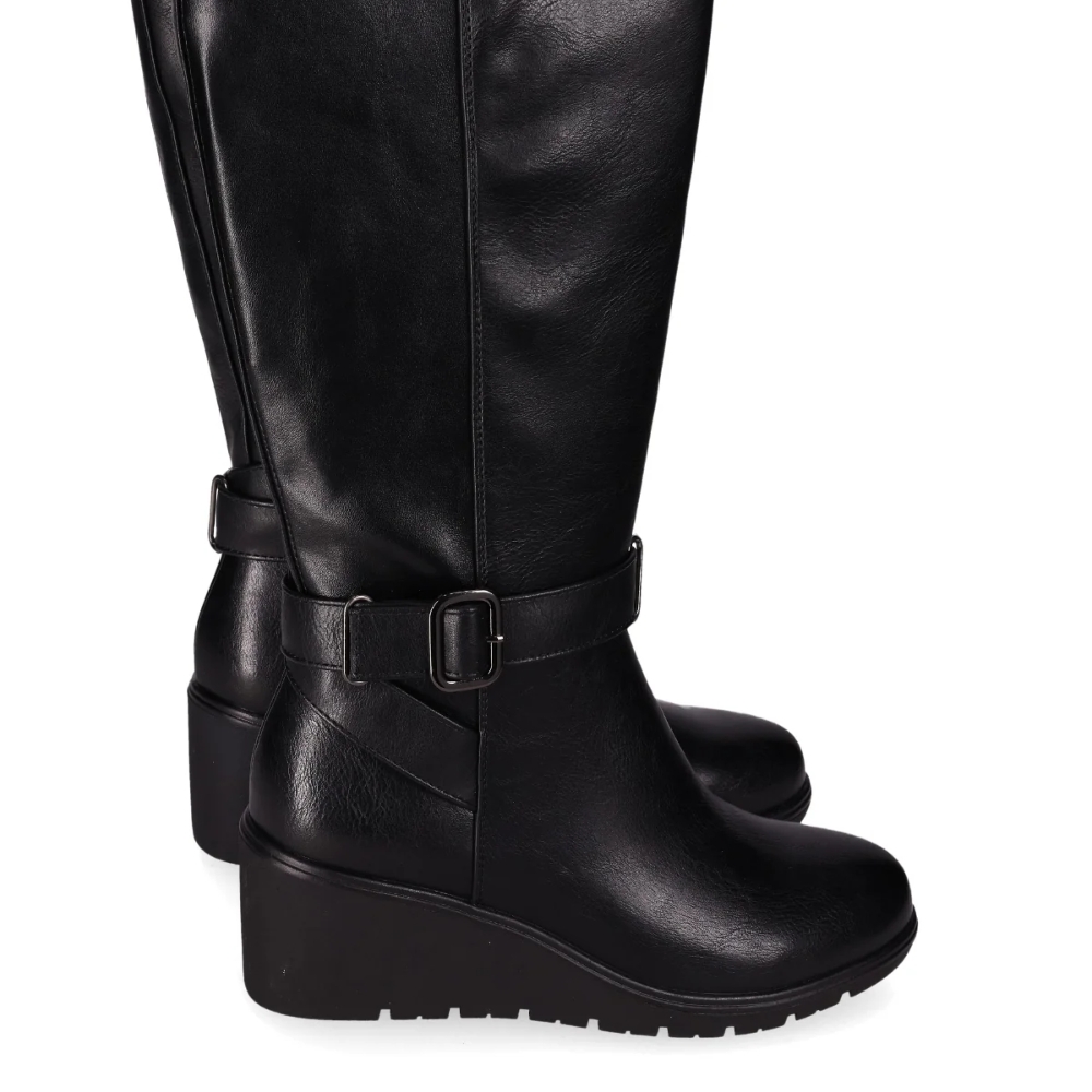 Bota de cuña baja en piel vegana. Con un diseño de caña alta, cuenta con un tacón de cuña y una correa con hebilla decorativa en el lateral. El panel elástico garantiza un ajuste cómodo y práctico, además de su cremallera lateral para mayor adaptación. ¡Combina estilo moderno y funcionalidad en un solo paso!