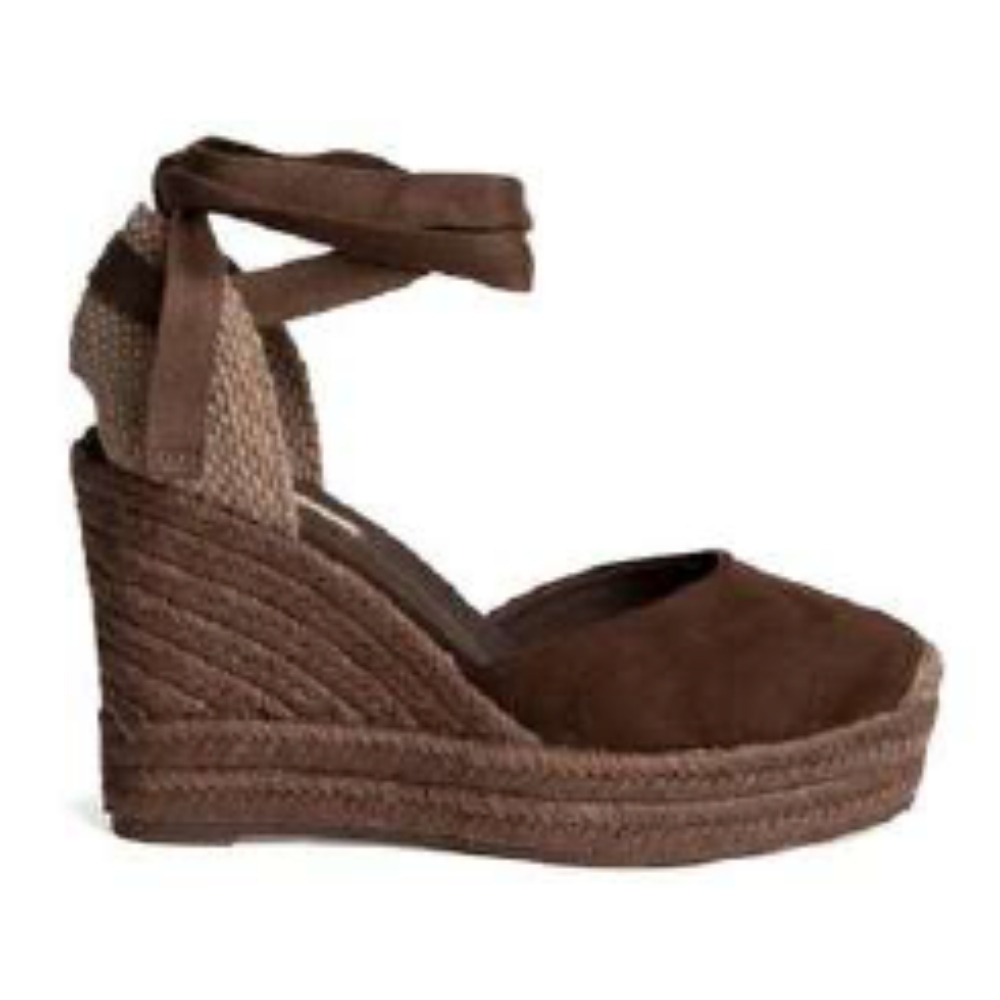 Plataforma tipo valenciana, con cuña en yute. Escote redondo. Cierre mediante tiras anudadas al tobillo.Altura del tacón 10 cm.Altura de la plataforma 3 cm.