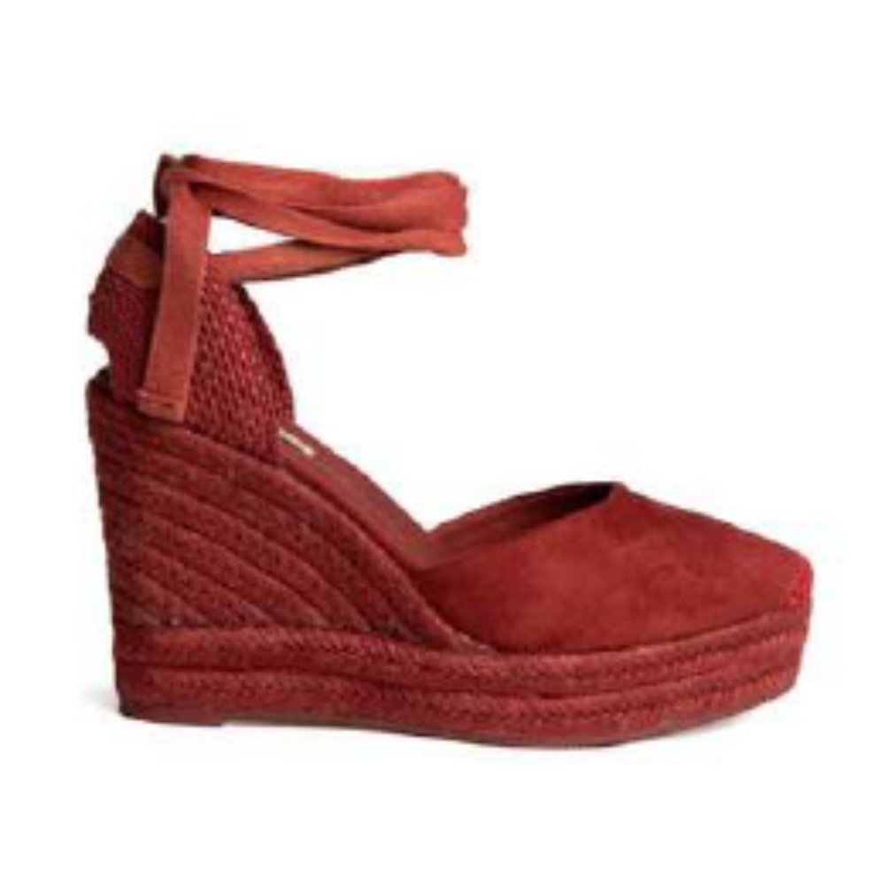 Plataforma tipo valenciana, con cuña en yute. Escote redondo. Cierre mediante tiras anudadas al tobillo.Altura del tacón 10 cm.Altura de la plataforma 3 cm.