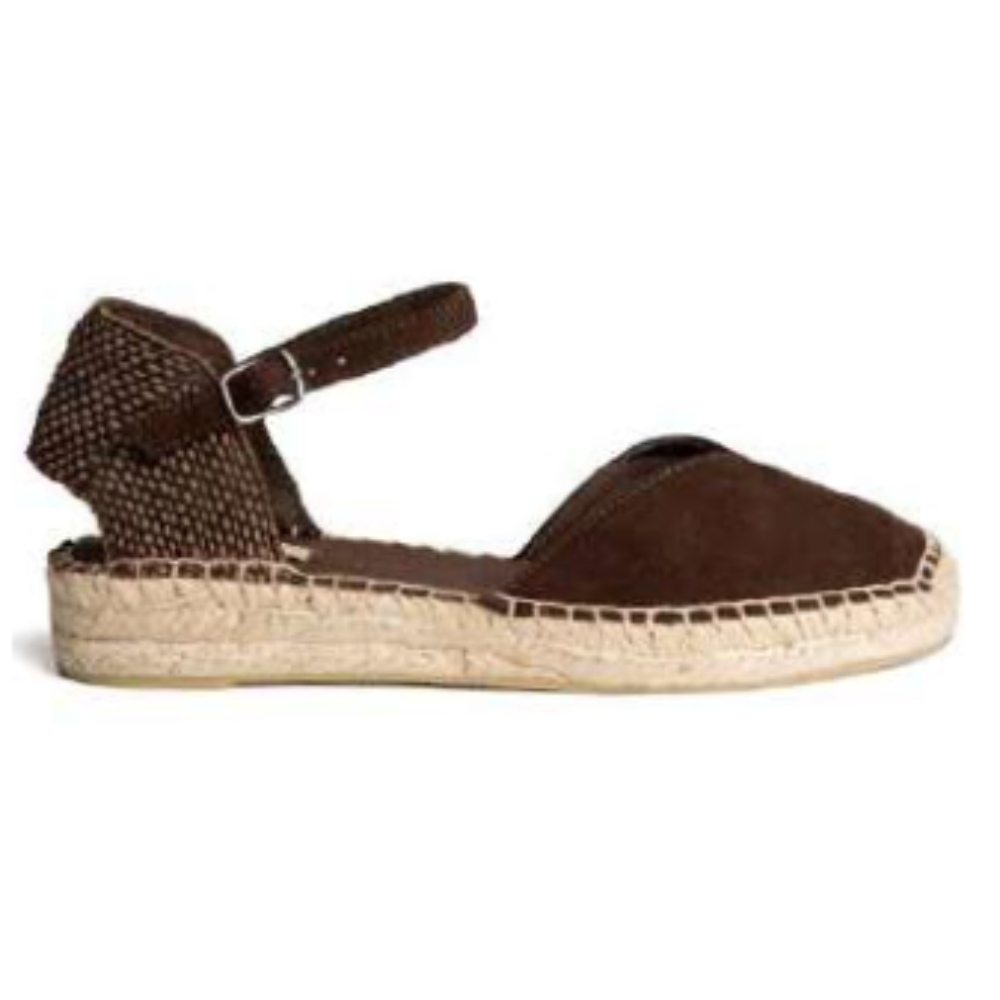 Alpargata tipo valenciana plana con cierre de hebilla. Suela de goma combinada con yute de gran calidad. Color cafe
