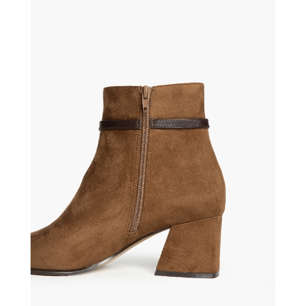 Botín de tacón medio. Detalle de tira fina con hebilla en la parte superior de la caña. Cremallera en la parte lateral interior. Tacón acho.