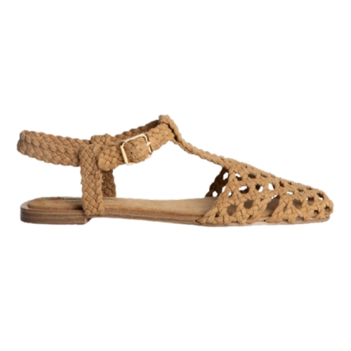 Sandalia plana tipo cangrejera. Cierre mediante hebilla al tobillo. Corte trenzado.Altura de la suela 1 cm.