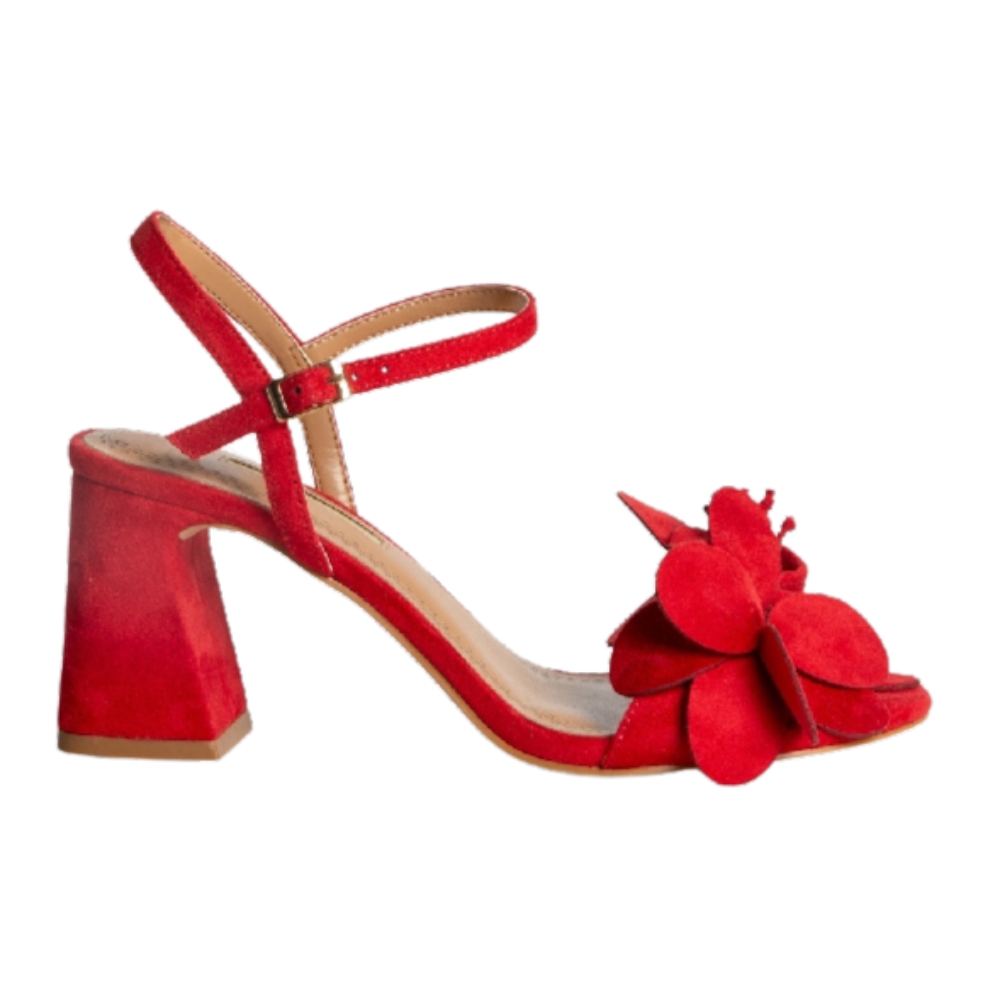 Sandalia con tacon de la marca Corina para mujer. Fabricada en material sintetico con flores en el empeine. Color rojo