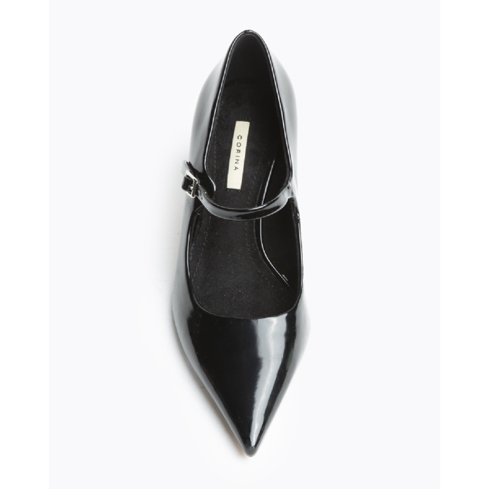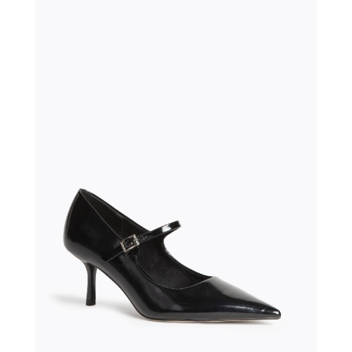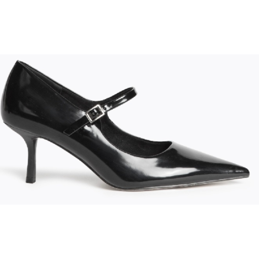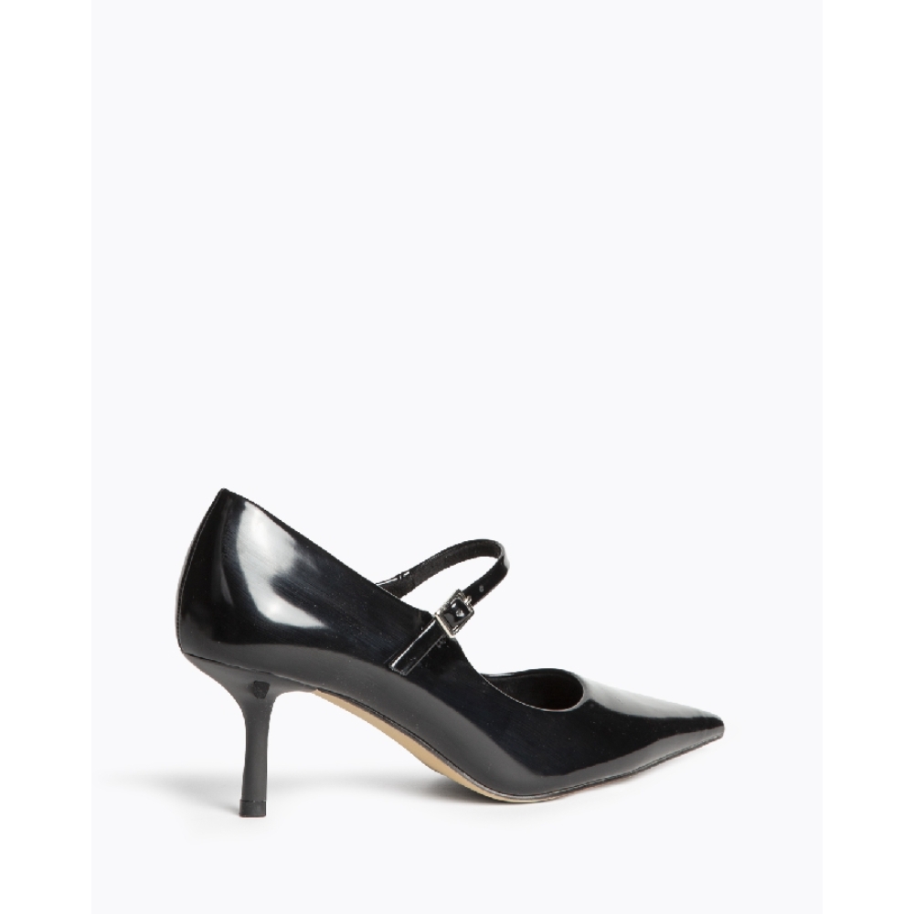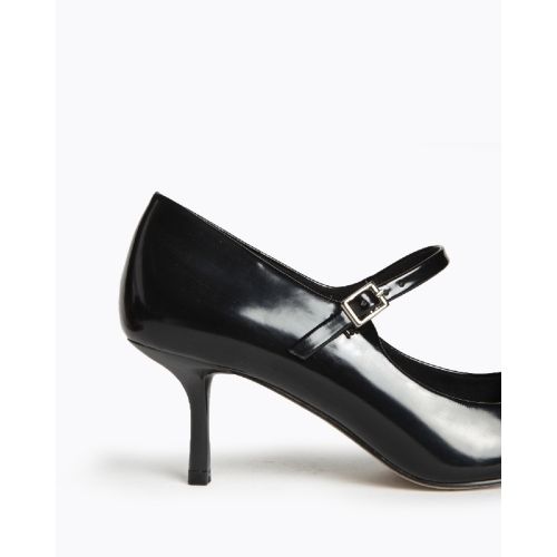 Zapato con tacón fino para mujer. Fabricado en material sintético tipo charol con hebilla. Color negro