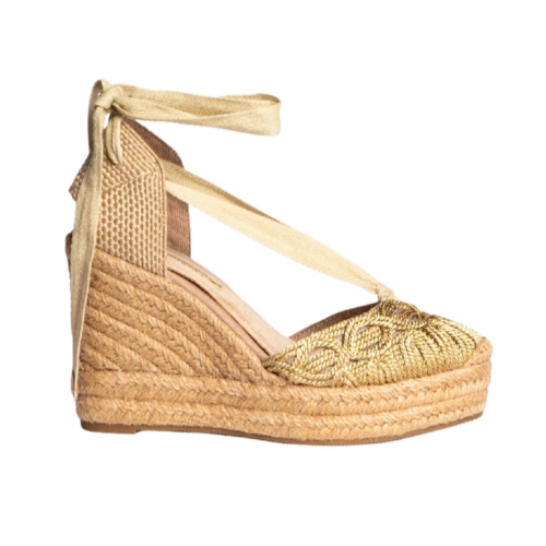 Plataforma tipo valenciana, con cuña de yute. Corte trenzado.Cierre mediante lazo atado al tobillo.