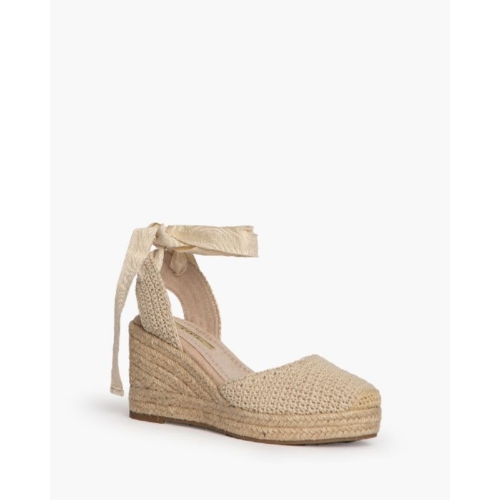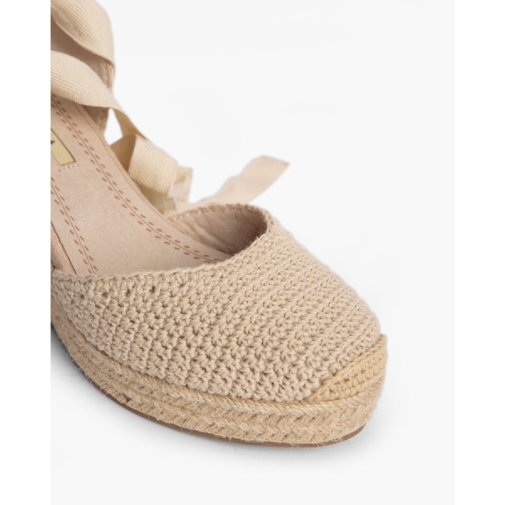 Plataforma tipo valenciana, con cuña en yute. Corte acabado en redondo en ganchillo. Cie-re mediante tiras anudadas al tobillo.