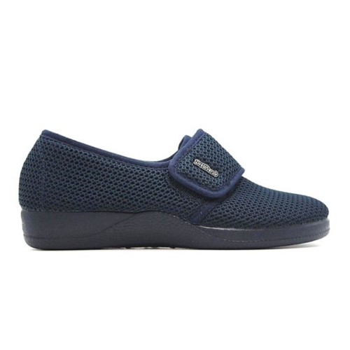 Pantuflas de casa cubiertas de ancho especial, con cuña de 4cm, de la marca DeValverde 1160 azul marino, cierre de velcro, de rejilla, con forro interior en textil y suela caucho natural (latex). Chinela Ideal para mantener tus pies frescos en verano. Zapatilla de casa para mujer, piso con grabado especial rugoso para evitar posibles deslizamientos. Fabricada con tejidos en microfibras y algodón que permiten una constante ventilación. Relleno de corcho natural para una total absorción de los posibles impactos. Respetuosos con la naturaleza. Utilizando materiales que cuidan al máximo posible el medio ambiente. Hecho en España.