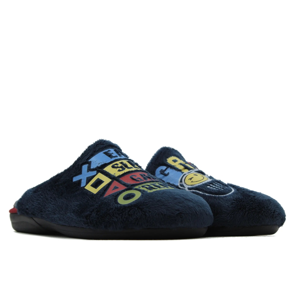 Zapatillas de casa para hombre con talón abierto y dedos cuebiertos, de la marca Devalverde, decoración Gamer con mando y botones de videoconsola, también tiene la frase: Eat Sleep Game Repeat, pantufla hecha en España en textil, Chinela con forro interior en textil y suela de goma muy cómoda.Piso con grabado especial rugoso para evitar posibles deslizamientos. Fabricada con tejidos en microfibras y algodón que permiten una constante ventilación. Suela con relleno de corcho natural para una total absorción de los posibles impactos. Utilizando materiales que cuidan al máximo posible el medio ambiente. Hecho en España. Lavables a mano. Otoño invierno.
