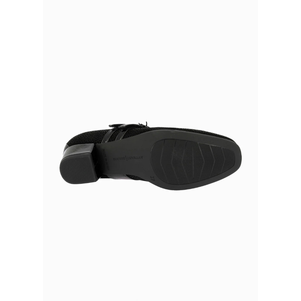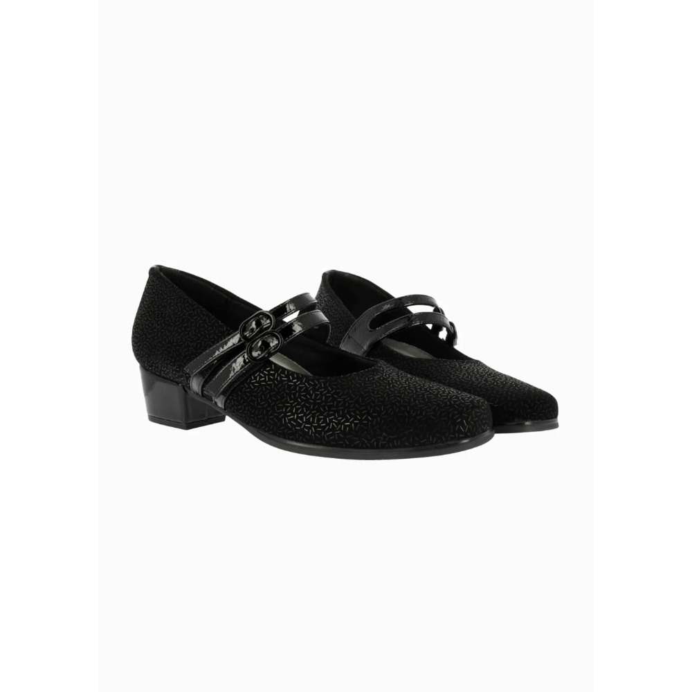 Zapato de tacón para mujer de corte mary jane con ancho especial. Fabricado en una combinación de piel y textil grabado. Cuenta con doble cierre de velcro, hebillas decorativas, tacón forrado y plantilla de piel extraíble.