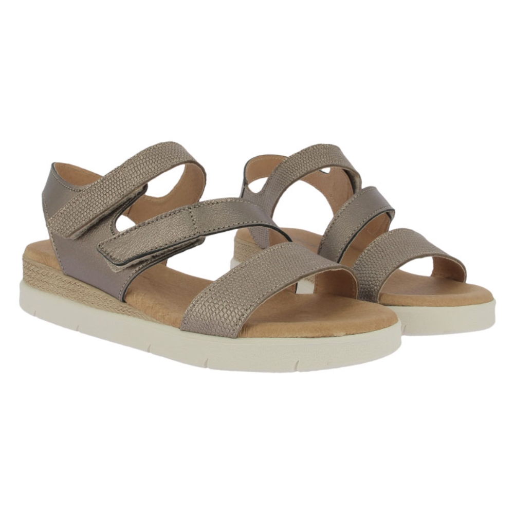 Sandalia de cuña de mujer fabricada en piel con tiras cruzadas en color bronce. Cuenta con forro y plantilla de piel, doble cierre de velcro y suela combinada.