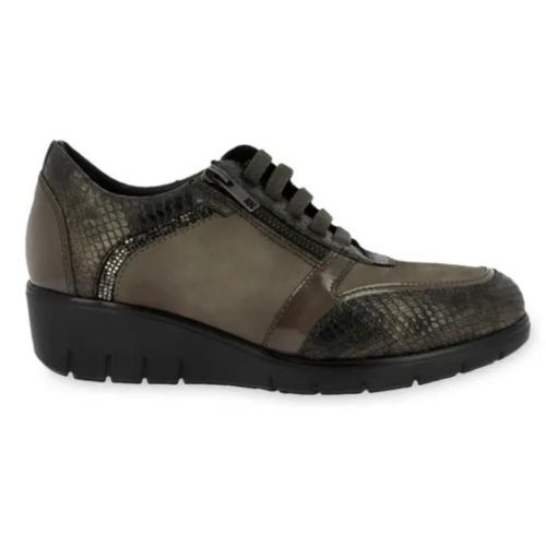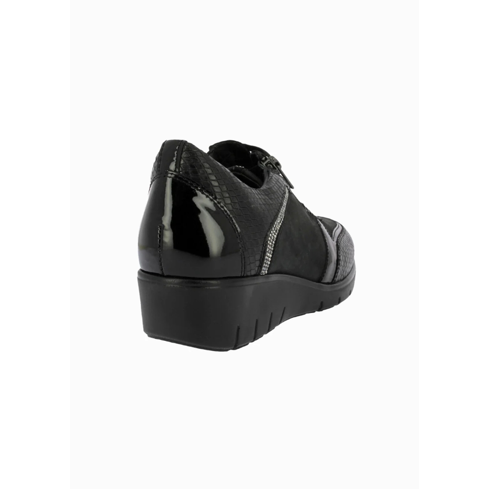 El Zapato 60351 para mujer en color negro combina elegancia y confort con su acabado en piel lisa y detalles en charol y grabado efecto serpiente. Diseñado para el día a día, ofrece cordones elásticos y cremallera lateral para un ajuste fácil, plantilla extraíble y forro suave que garantiza comodidad prolongada. Su suela de cuña con goma antideslizante proporciona seguridad y estabilidad en cada paso, convirtiéndolo en la elección perfecta para la temporada de otoño-invierno con estilo y funcionalidad.