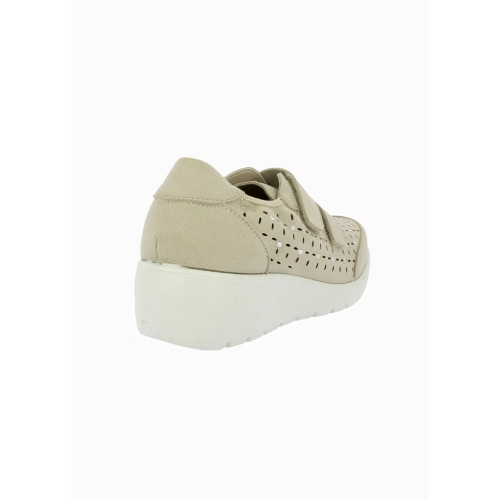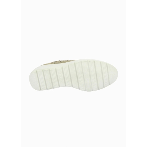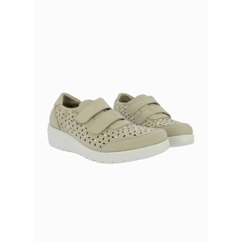 Deportivo para mujer de material vegano con picados y detalle de brillos en color platino. Cuenta con puntera y talón reforzados, cierre de doble velcro en el empeine, plantilla extraíble Memory Foam y suela de eva ligera.
