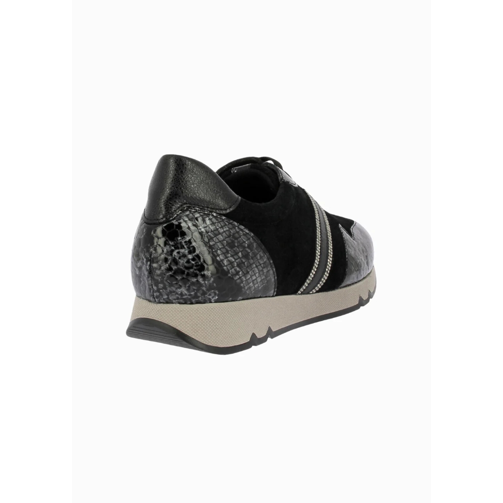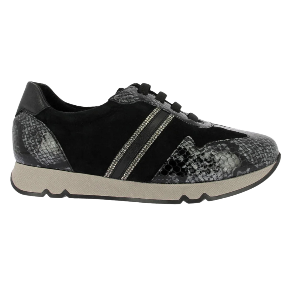 Zapato para mujer tipo deportivo fabricado en combinación de piel lisa y estampada en color niebla. Cuenta con detalle de banda lateral con brillos, cierre de cordones elásticos, plantilla extraíble y suela ligera dentada.