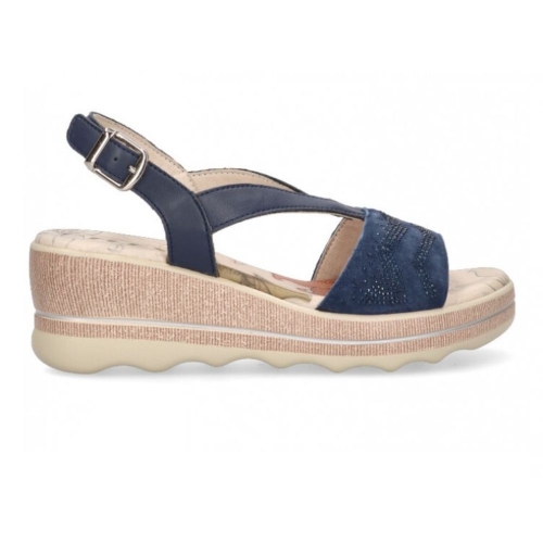 Sandalia para mujer con cuña media y exterior en piel. Muy cómoda y ponible. Color azul.