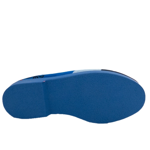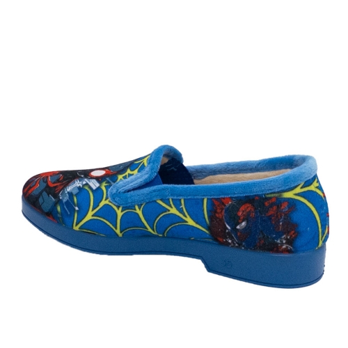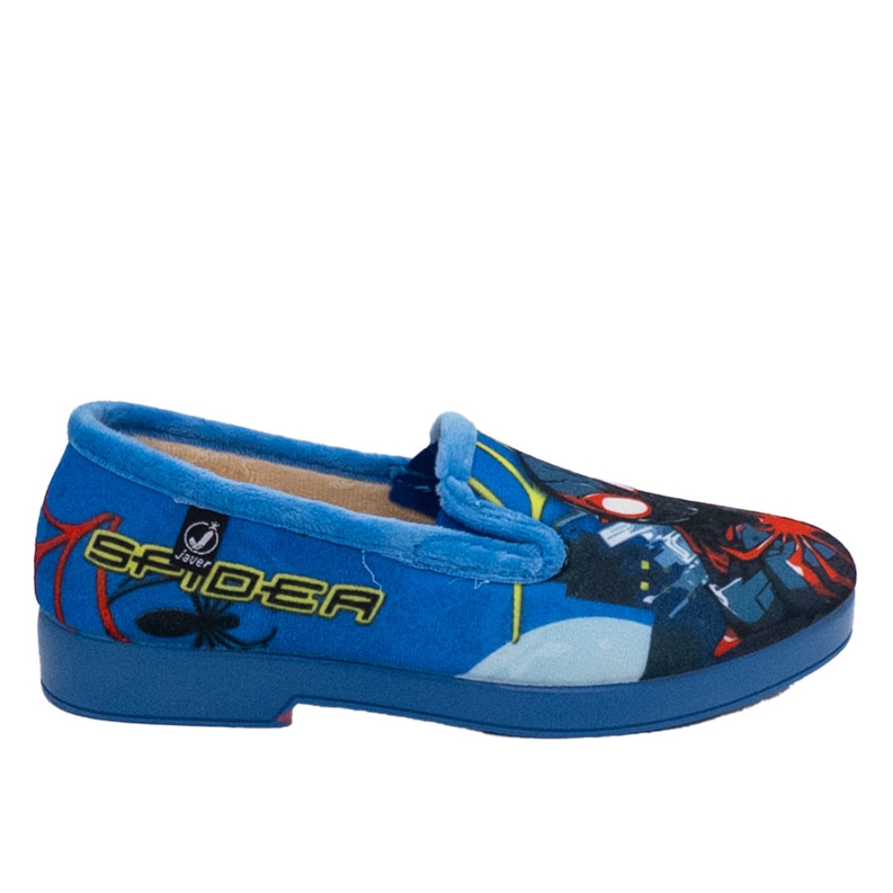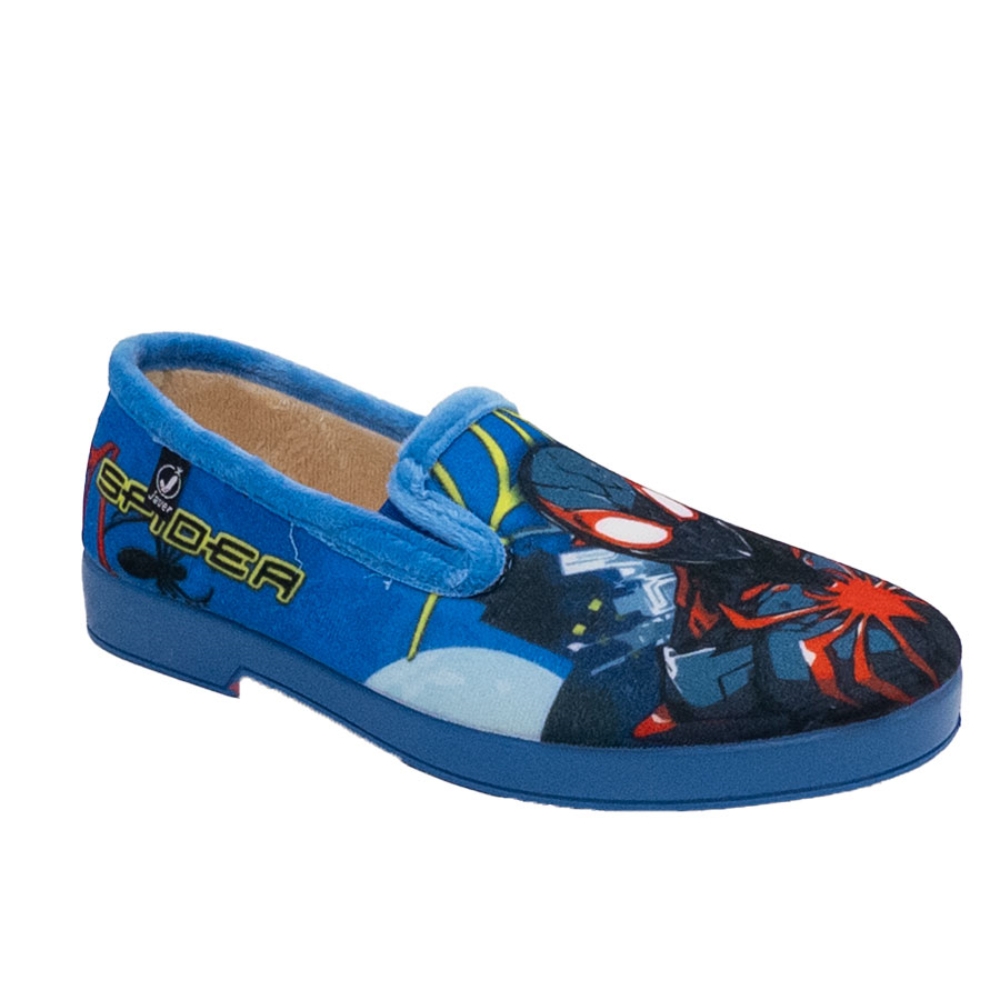 Zapatilla invierno de casa para niños, muy cómoda, estilo copete, corte en tejido estampado, de color marino, adornos: serigrafía de elementos de spider ribete al tono imitación terciopelo, con prácticos elásticos laterales que facilitarán el calce en el pie. Forro y planta en tejido suave y tono beige. Suela de goma clásica al tono. Fabricada en España.